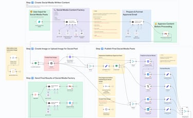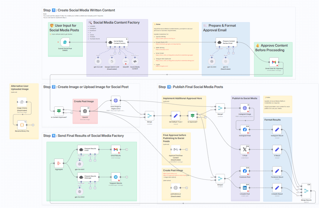 Trigger campaign → GPT-4/Gemini (generate post, hashtags, CTAs, emojis) → OpenAI/Pollinations.ai (create image/video) → SERP API (find relevant content) → Gmail (send for review & approval) → API (publish to Instagram/Facebook, X/Twitter, LinkedIn) → Slack/Sheets (log post & timestamp)