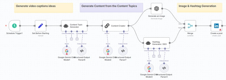 Schedule Trigger (daily or custom) → Google Gemini Node (generate unique content topic) → Google Gemini Node (expand topic into full post) → DALL-E Node (create custom image) → Google Gemini Node (generate SEO-friendly hashtags) → LinkedIn Node (merge text, image, hashtags) → LinkedIn Node (publish post) → Slack/Sheets Node (log post and timestamp)